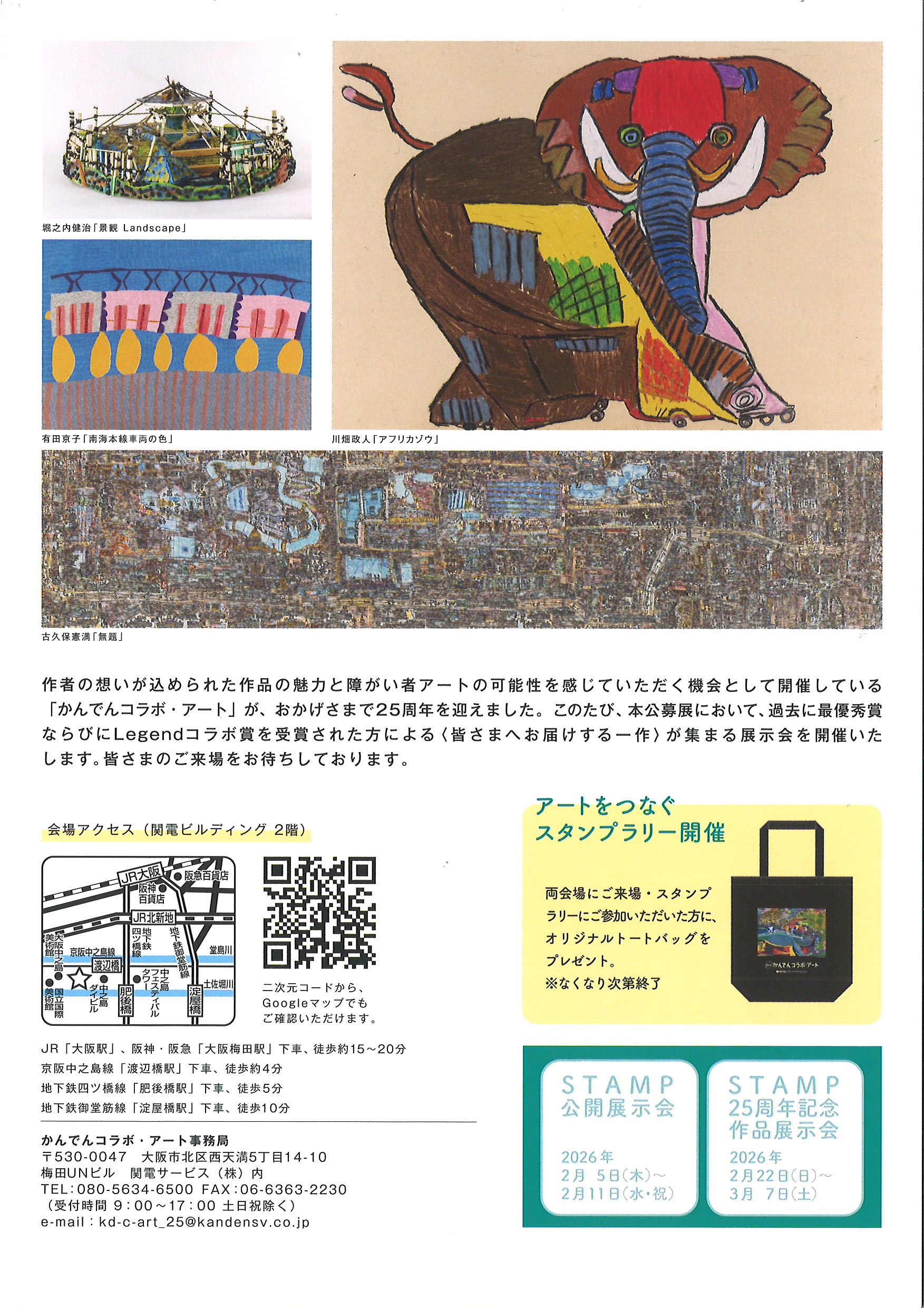 作者の想いが込められた作品の魅力と障がい者アートの可能性を感じていただき機会として開催している「かんでんコラボ・アート」が、おかげさまで25周年を迎えました。このたび、本公募展において、過去に最優秀賞ならびにLegendコラボ賞を受賞された方による<皆さまへお届けする一作>が集まる展示会を開催いたします。皆様のご来場をお待ちしております。